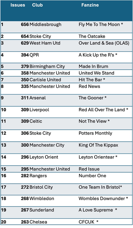 In this case not all these fanzines are still going, an asterisk * denotes the ones still in print. As with age, there are a remarkable number of smaller clubs in the table and it’s truly amazing that Stoke manage to have two fanzines in the Premier League by this classification.