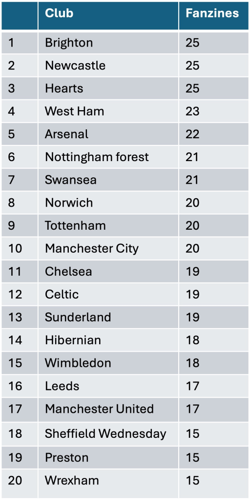Our final Premier league table for now, once again this table is surprising. Though dominated a little more by big city or successful clubs, it’s interesting that most of these zines listed were published when many of these clubs were outside of their glory years and in many cases outside of the top-flight. Further blogs will explore the reasons for this.