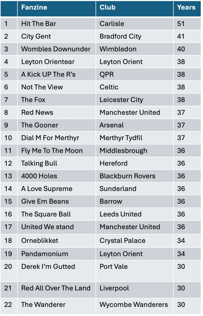 Fanzines in this table must be still publishing in print so first and foremost, congratulations to Hit The Bar, the first and so far only fanzine to hit 50 years old. Incredible support through thick and thin for one of the great footballing outposts of the isles.