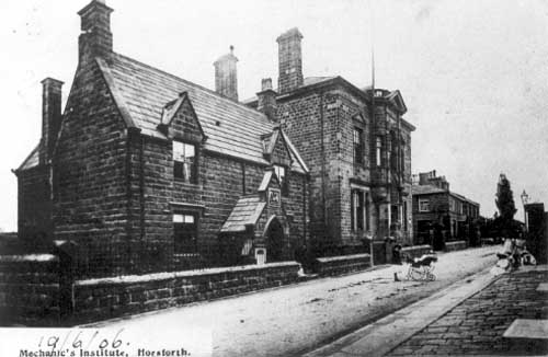 An article on Horsforth’s most notable buildings would not be complete without reference to the building that houses Horsforth’s library today, the Mechanics Institute. Mechanics’ Institutes were educational institutions, particularly popular in the 19th century, which were formed to provide means of self-help education for working people. Horsforth Mechanics Institute was built in 1882 of local millstone grit on land donated by Sir W.T.W. Spencer-Stanhope, and is one of the few listed buildings in Horsforth. It included a large meeting room, reading room and a library (see Leodis).  The police station adjoined the building.