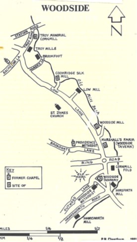 Horsforth was originally an agricultural community, before expanding rapidly during the Industrial Revolution. The home-based hand weaving of woollen cloth would have been the principal industry, but Horsforth saw the rise of many other industries, including textile production in the mills, tanning, quarrying, soap making, coal mining, silk spinning, corn grinding and dyeworks. The Woodside area of Horsforth was home to many of its mills, as is shown on the map below: