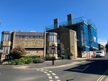 Horsforth Community Centre today, complete with scaffolding. Photograph: Janet Pinder 2025. (c) Leeds Libraries, http://www.leodis.net