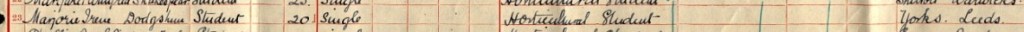 Studley closed in 1969, but during the years it was open it hosted many women from all around the world. Davison mentions one person who might be of interest to us – Marjorie Dodgshun of Leeds, who was cited as having graduated Studley in 1911 and appeared as a student of the college on the 1911 census. Did Marjorie spring from a gardening family? Did she go on to make her career in horticulture? Let’s use the resources of the Local and Family History Library to find out!