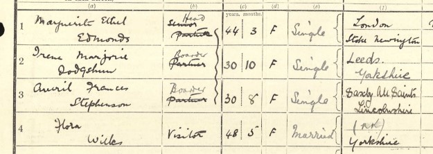 This is extremely interesting because it looks like an enumerator has corrected this entry which has distorted the household composition. Originally, the three women have described themselves as partners, with Marguerite Ethel Edmonds as the senior partner. Marguerite is a market gardener, Marjorie a market gardener/chauffeuse and Averil Frances Stephenson a herdswoman. This very much looks to me like they are living the Studley dream, an all-female agricultural co-operative. Their home is described as having a total of 7 rooms and on the 1921 census they have a visitor from Yorkshire, a Mrs Flora Wilkes or Willes. The enumerator has changed Marjorie and Averil to boarders, which isn’t a true representation at all.