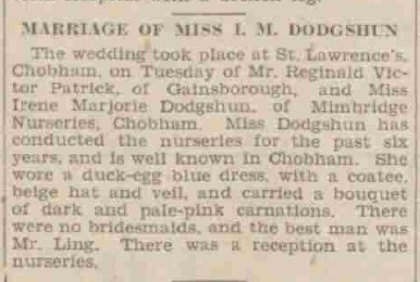 As far as I can tell, the site is still dedicated to horticulture, it’s a nice garden centre called Longacres these days. Looking at maps of the area at the time Marjorie was there, there are a lot of nurseries in the area – however only one that is right in centre of Mimbridge. Like at West Dene, Marjorie shared her home and possibly her business with others – Margaret Hammond Lancaster and Doris Page are both on the electoral register at the same address more than once. By the time of the 1939 Register there are three people living at Mimbridge Nurseries – Marjorie, a market gardener, Doris Page, her assistant, Marg E Edmonds, a retired gardener; and Reginald Patrick, a radio officer in the ‘merchant marine.’ We’ve met Marg. E Edmonds before, the senior partner at West Dene. Neither Marguerite nor Doris are on the 1911 register at Studley, and Doris proved very hard to track. Reginald Patrick is a little more traceable – born in Lincolnshire in 1888, Reginald saw active service in the Great War as a radio operator, a profession he continued with after the conflict, with electoral registers linking him to HMS President, a shore establishment at Tower Hamlets. It’s not known from the records how he came to be at Mimbridge Nurseries, but he and Marjorie married in July 1941. The happy occasion was reported in the local paper.