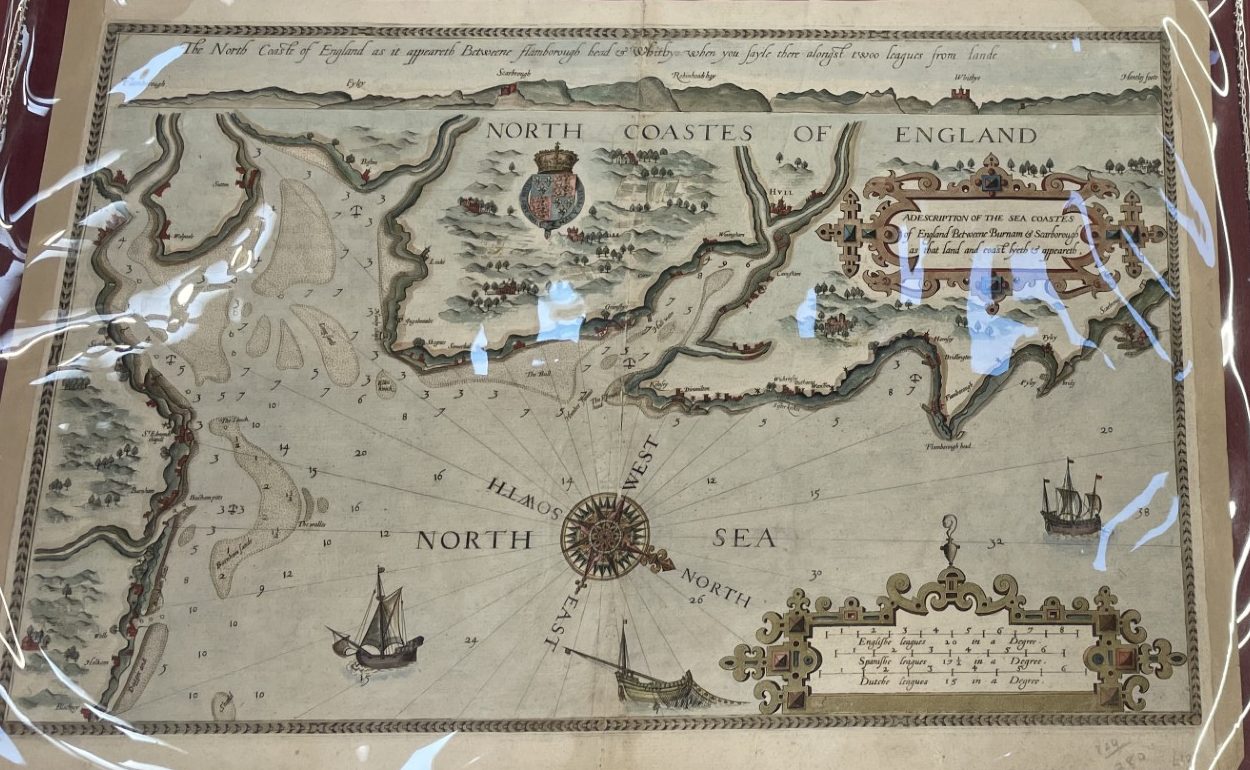 This particular map is a fine example of the east coast of England from Blakeny in Norfolk to Scarborough in Yorkshire. Identified on the coast are the towns of Burnham, Kings Lynn, Boston, Skegness, Grimsby, Hull, Hornsea, Bridlington and Scarborough amongst others. Across the top of the plate are a series of coastal profiles. The whole is ornately decorated with three ships, one fishing, an ornate compass rose and two cartouche.