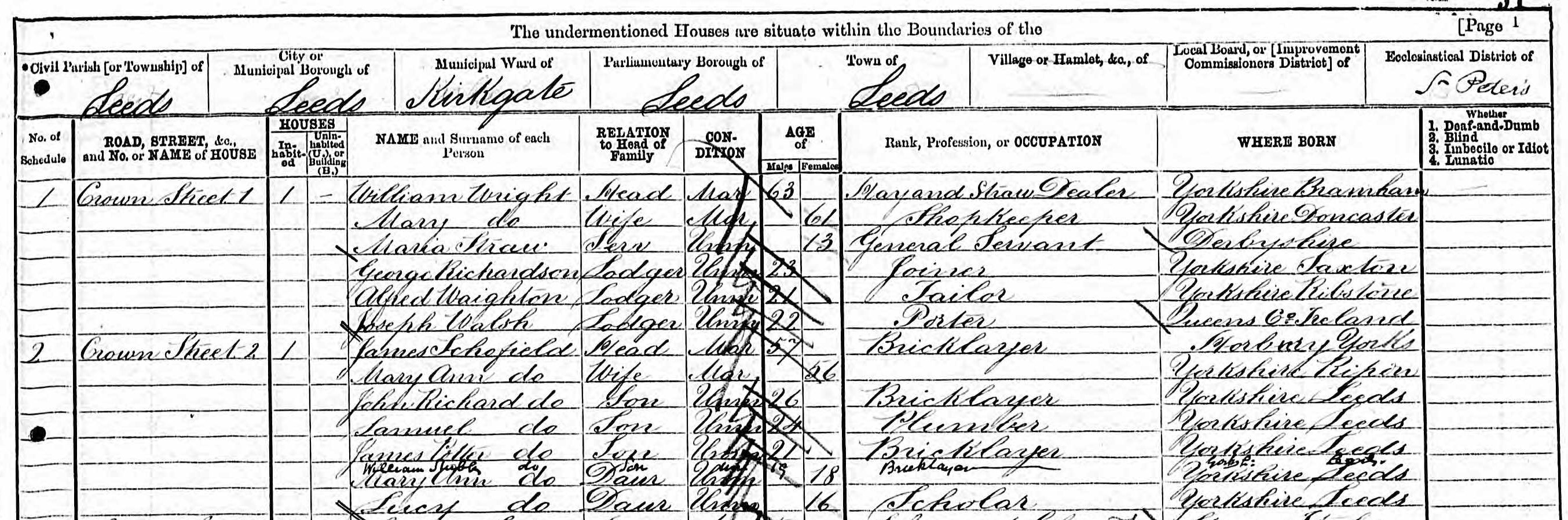 By the time of the 1871 census the family are still in Crown Street at no. 2. Schofield is now 21 and following in his father’s footsteps as a bricklayer. His siblings still living at home included John, Samuel, Mary Ann and Lucy. His younger brother, William Stubbs Scofield, 19, was also still living at home and also working as a bricklayer.