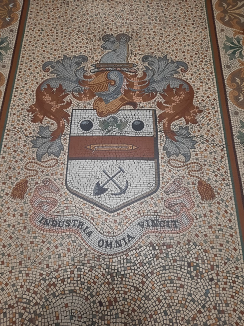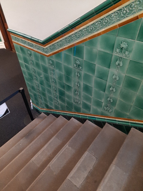 Meanwhile, to learn more about the fate of Morley’s Museum collection, I visited Morley Library to meet with Librarian Trudi Foster and members of Morley Community Archives. If you haven’t been to Morley, it’s a wonderful building, opened in 1906 as a Carnegie Library resplendent with tiled pillars and mosaics created by T.K. Yeates of Leeds, stained glass, and an entrance hall guarded by a posse of classic authors.