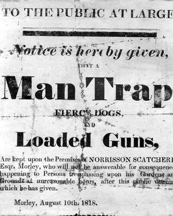 Also acquired by Batley was a man-trap owned by Morley antiquarian Norrisson Scatcherd, renowned author of The History of Morley, together with a warning notice as seen in this photo from the Leodis archive.