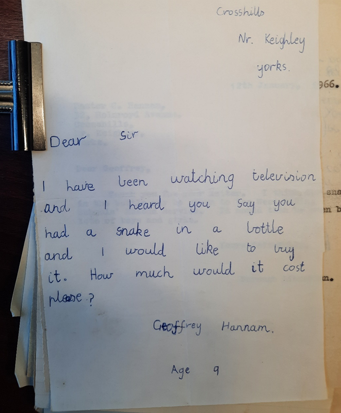 Initially, it was agreed that the museum collection should be offered to the public. On 10th January 1966, a Granada TV appeal was made on “Scene at 6-30”, calling on the public to rehouse museum collection items. The response was overwhelming. A flood of letters came in from collectors, schoolteachers, a holiday park, a zoo, Leeds College of Art, a member of the Society of Archer-Antiquaries, and large numbers of enthusiastic children, such as this one from nine-year-old Geoffrey Hannam of Crosshills nr. Keighley, who writes “Dear Sir, I have been watching television and I heard you say you had a snake in a bottle and I would like to buy it. How much would it cost please?”