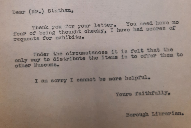 Sadly for Geoffrey and all the other budding herpetologists, Borough Librarian Mr RG Benjamin rapidly came to the conclusion that dispersing the museum collection to all and sundry would be unworkable. Nevertheless, Mr Benjamin individually replied to each correspondent, explaining to them that the collection items would now be offered solely to local museums and schools. This seems to have been quite a considerable task.