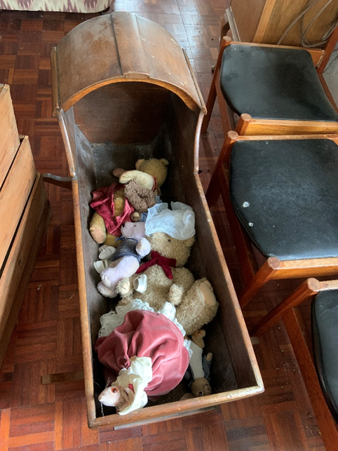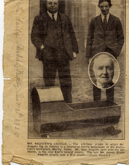 However, even before this, items were offered for return to their original donors or the donors’ families. Among those that were reclaimed in this way is Asquith’s cradle. Luckily we can bring the story right up to date. The cradle was returned to James Henry Asquith and his wife Anne. James Henry, as seen here with his father Samuel, was the grandson of Herbert Asquith’s cousin, James Dixon Asquith. He was the owner of J Asquith & Son Ltd, Textile Engineering and machine makers of Albion Works, Marshall Street, Morley, who made stainless steel dyeing machinery, rubber rollered scouring machines, milling machines, and fibre glass trucks. From him the cradle passed down through the family, and this photo shows the cradle as it was last year, before it was sold at auction.