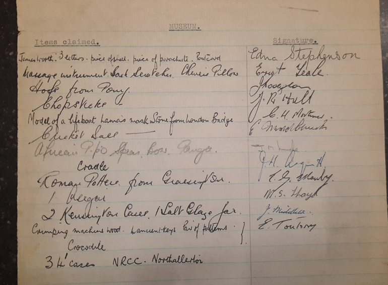 The list of items claimed by their donor’s families can also help us to answer a question posed in my previous blog. In 1908, former Morley Mayor William Middlebrook loaned a cricket ball to the museum. Did he ever get his ball back? Well, the document shows that a cricket ball was indeed returned, beside a signature that possibly reads as E Middlebrook. So it took almost sixty years, and must have skipped a generation or two, but yes, the Middlebrooks did indeed get their ball back. It was sadly too late for William to play any matches with it though.