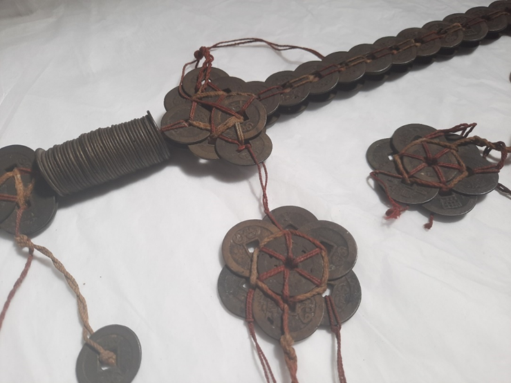 Up in the storerooms, Frances Stonehouse of Kirklees Museums and Galleries dug through the boxes to seek out treasures. First up, two Chinese money swords. Often used to give protection from evil spirits, these swords may be hung above the bed of those sick with fever, or used during a woman’s confinement, according to the British Museum. Some of the coins in these swords were inscribed with what looked to my untrained eye like traditional Chinese characters, but on other faces were very different looking inscriptions, perhaps in the Manchu script as explained in this Lincoln Museum guide to Qing dynasty coins.