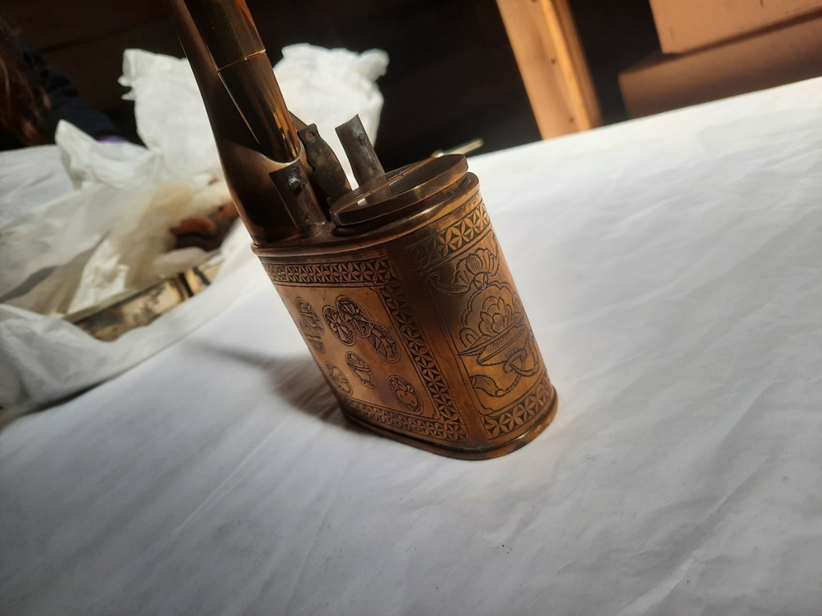 We found several other Chinese objects too. One had been described in the accessions book as a ‘Chinese pipe’. I was expecting a tobacco pipe, but it turned out to be a beautiful metal opium pipe, about 50cm tall with an engraved bowl.