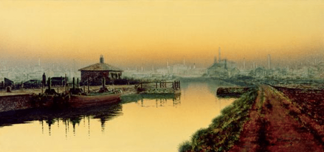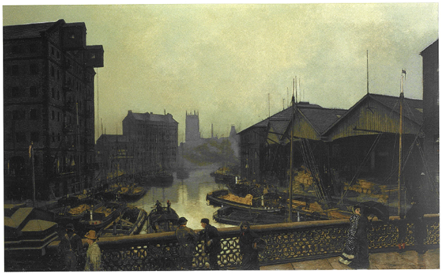 Besides the now vanished busy traffic of the barges, it also shows the wide spectrum of Leeds society in the people depicted on the bridge going about their everyday lives. Some buildings are still recognisable, such as St Peter’s Church and the warehouse to its left. The painting is also significant in that it was bought by Grimshaw’s most important patron in Leeds, Walter Battle.
