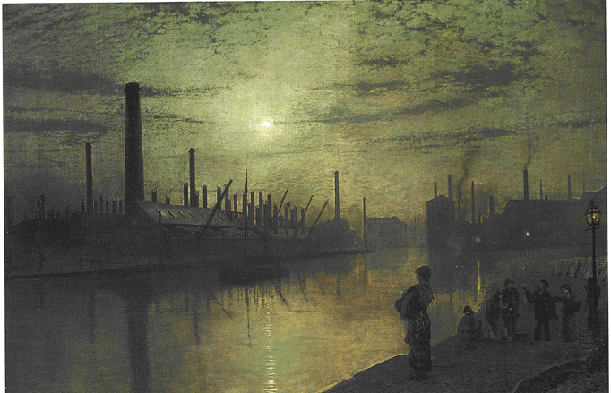 This work is particularly significant as Grimshaw painted very few pictures of industrial buildings and rarely made social comment. The location for the artist’s viewpoint is thought to be Knostrop Cut, across from Hunslet Mills. This was established by the Art Gallery curator Nigel Walsh and the curator of Industrial History, John McGoldrick, when the painting returned to Leeds in 2022 after being housed in a private collection for many years. It was painted at a time of great hardship for industrial workers and strike action was common. Grimshaw lived just along the river at Knostrop Hall at the time. As with many of the twilight and moonlit suburban scenes, we are drawn to the figure of the woman and curious to know her story. Who is she and what are her thoughts as she looks out across the water? Robertson notes that the view is a grim stretch along the river in Leeds and that it was described by the Yorkshire Post as follows: