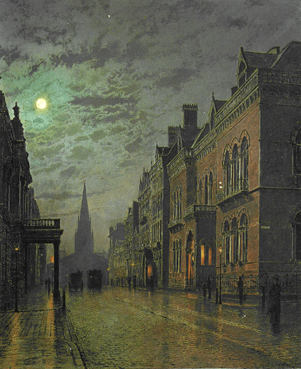 Grimshaw’s work captures the modern feel of the new commercial buildings in Leeds centre, whilst giving them a more timeless quality in seeing them by moonlight. Alexander Robertson in Atkinson Grimshaw ( c1988 ) L Q B GRI describes this work as, “Grimshaw at his finest in conveying the mysteries of night-time in the town.” He notes that the Leeds Mercury found in it, “the same wonderful effects, the same grand gradations of tone, the same close attention to minuteness of detail, which most of his previous productions have displayed.” Despite a different theme to the suburban scenes there is the same air of moonlit mystery and atmospheric beauty common to much of Grimshaw’s work.