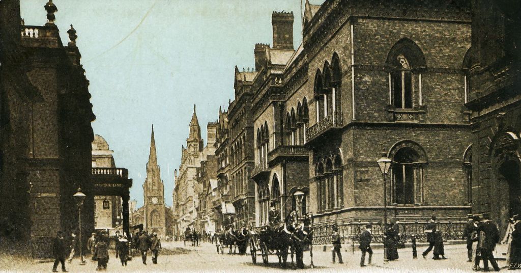 The photograph above shows a tinted postcard of the same scene just a few years later, possibly around 1898, taken from the Leodis website. That view today has some buildings that are recognisable, although Beckett’s Bank has long been demolished and the National Westminster Bank now stands in its place. The original Leeds Cathedral, which can be seen at the end of Park Row, was also demolished in the late nineteenth century, to make way for the widening of the Headrow. It was then rebuilt in its present position on Cookridge Street and its former site later developed by the Leeds Building Society. The site is now Browns Brasserie and Bar.