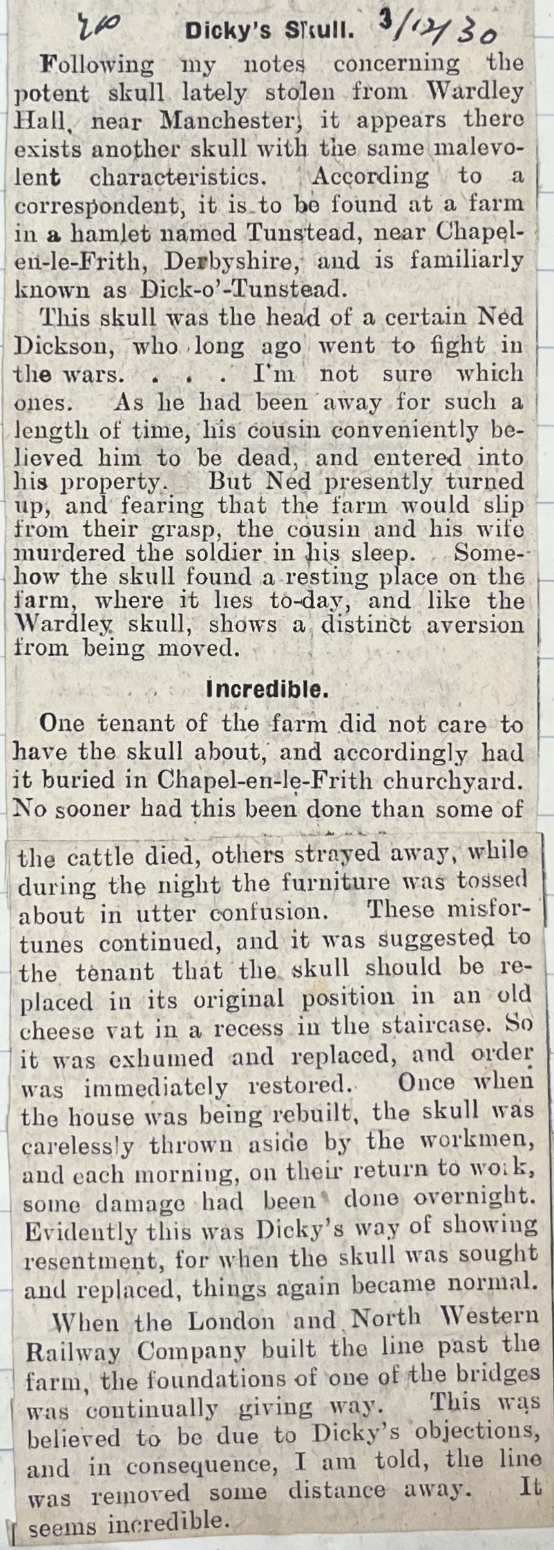 Following my notes concerning the potent skull lately stolen from Wardley Hall, near Manchester, it appears there exists another skull with the same malevolent characteristics. According to a correspondent, it is to be found at a farm in a hamlet named Tunstead, near Chapel-en-le-Frith, Derbyshire, and is familiarly known as Dick-o’-Tunstead.