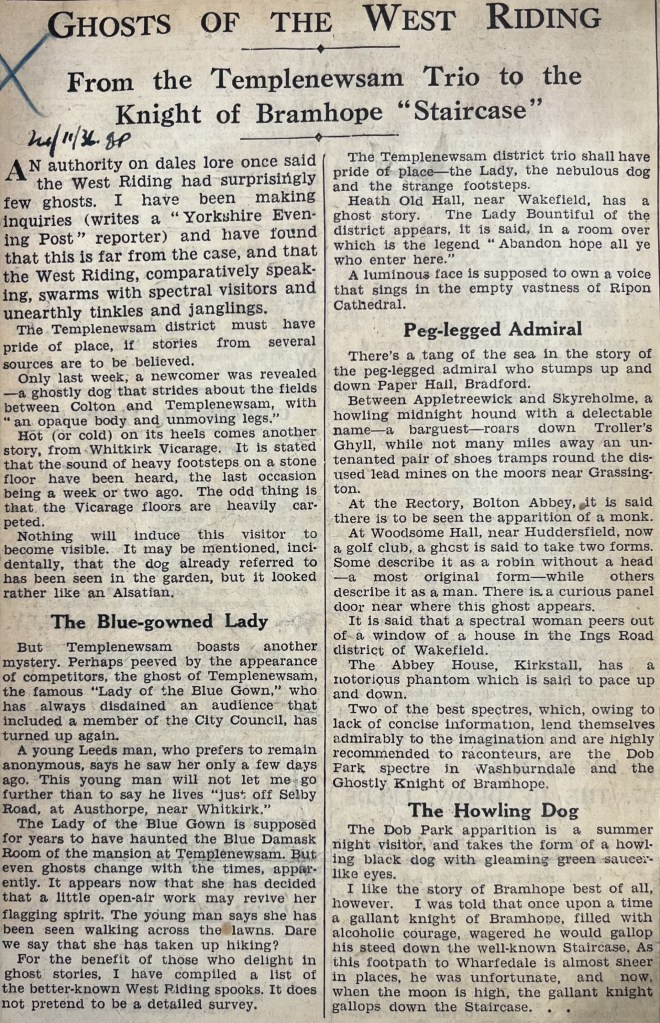 An authority on dales lore once said the West Riding had surprisingly few ghosts. I have been making inquiries (writes a “Yorkshire Evening Post“ reporter) and have found that this is far from the case, and that the West Riding, comparatively speaking, swarms with spectral visitors and unearthly tinkles and janglings.