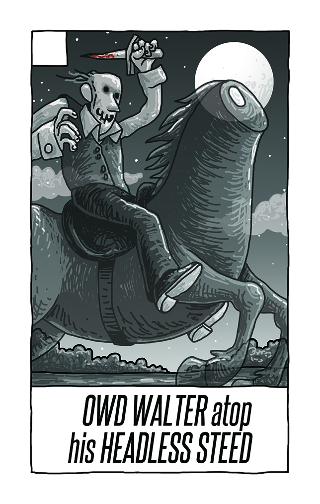 Clutching a dripping dagger high in his right hand, the foremost horseman rode straight for the rock behind which the villager crouched. His headless steed cleared the stone with a mighty bound, and, crying “A pun more weight, lig on, lig on!” he galloped out of sight. His companions, uttering shrieks of mirth, followed, and quickly all were swallowed up in the fastnesses of the woods.