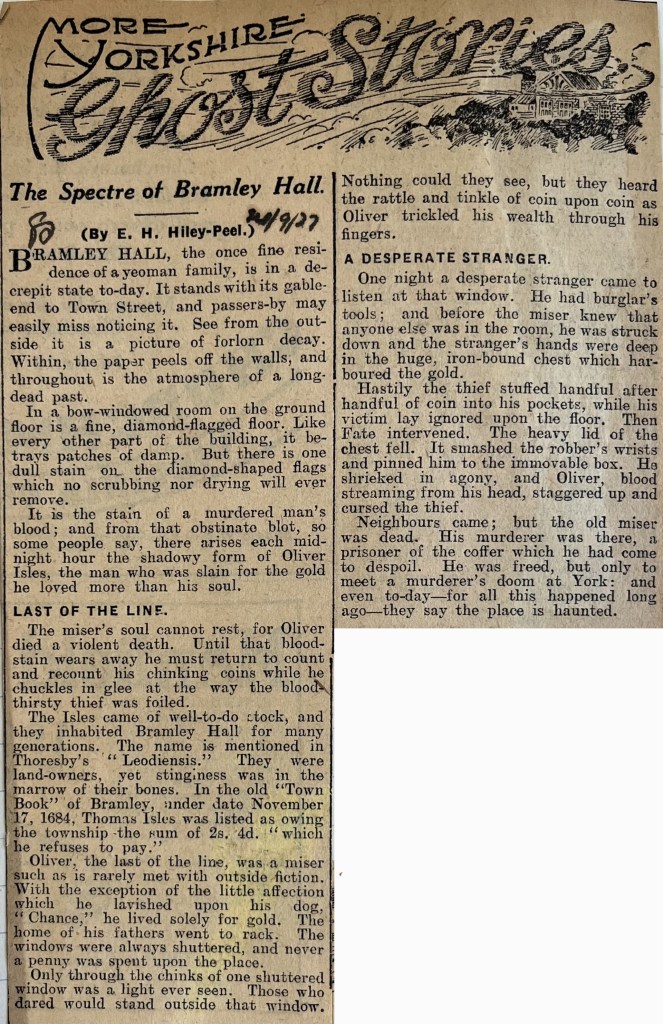 Bramley Hall, the once fine residence of a yeoman family, is in a decrepit state to-day. It stands with its gable-end to Town Street, and passers-by may easily miss noticing it. See from the outside it is a picture of forlorn decay. Within, the paper peels off the walls, and throughout is the atmosphere of a long dead past.
