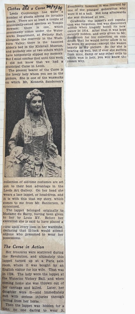 Leeds Corporation has quite a number of ghosts among its invisible assets. There are at least a couple of municipally-owned spectres at Temple Newsam; there is one, which presumably comes under the Waterworks Department, at Swinsty Hall, alongside the reservoir in the Washburn Valley; there is the haunted Abbot’s bed in the Kirkstall Museum, and probably one or two others which have temporarily slipped my memory. But I must confess that until this week I did not know that we had a municipal Curse in Leeds.