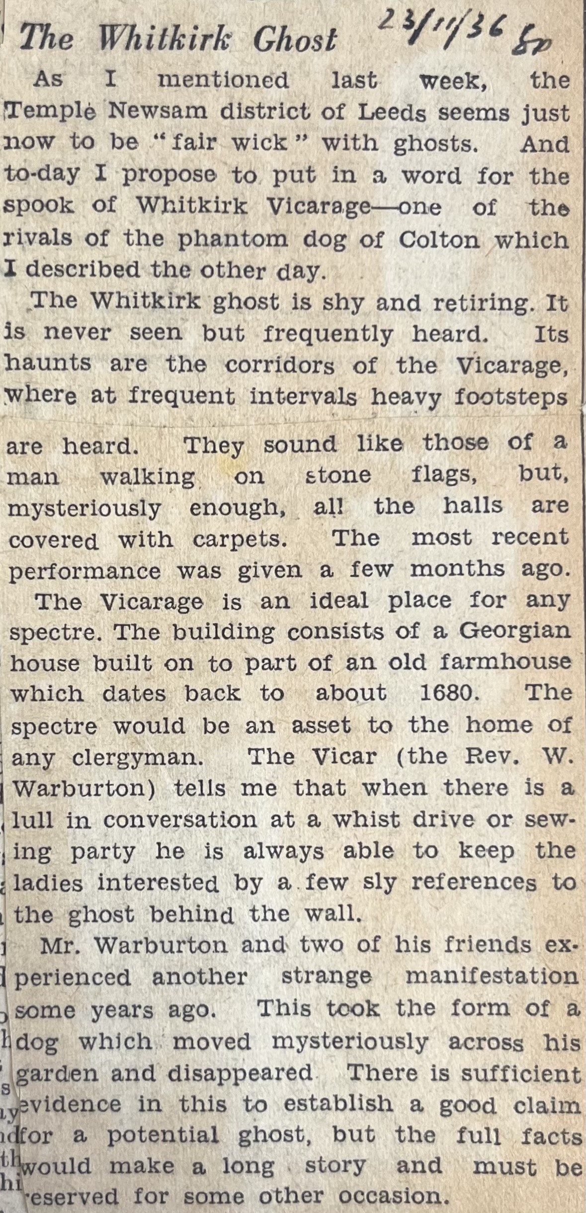 As mentioned last week, the Temple Newsam district of Leeds seems just now to be “fair wick” with ghosts. And to-day I propose to put in a word for the spook of Whitkirk Vicarage – one of the rivals of the phantom dog of Colton which I described the other day.