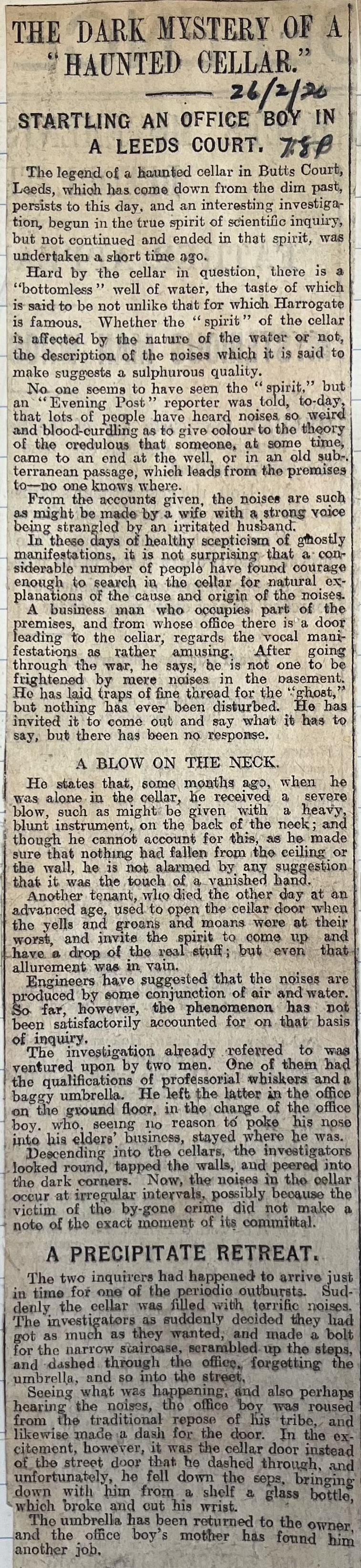 The legend of a haunted cellar in Butts Court, Leeds, which has come down from the dim past, persists to this day, and an interesting investigation, begun in the true spirit of scientific inquiry, but not continued and ended in that spirit, was undertaken a short time ago.