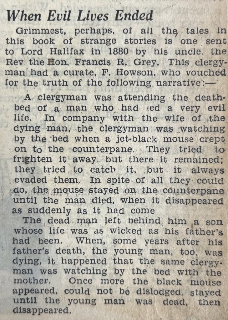 A clergyman was attending the deathbed of a man who had led a very evil life. In company with the wife of the dying man, the clergyman was watching by the bed when a jet-black mouse crept on to the counterpane. They tried to frighten it away but there it remained; they tried to catch it, but it always evaded them. In spite of all they could do, the mouse stayed on the counterpane until the man died, when it disappeared as suddenly as it had come.