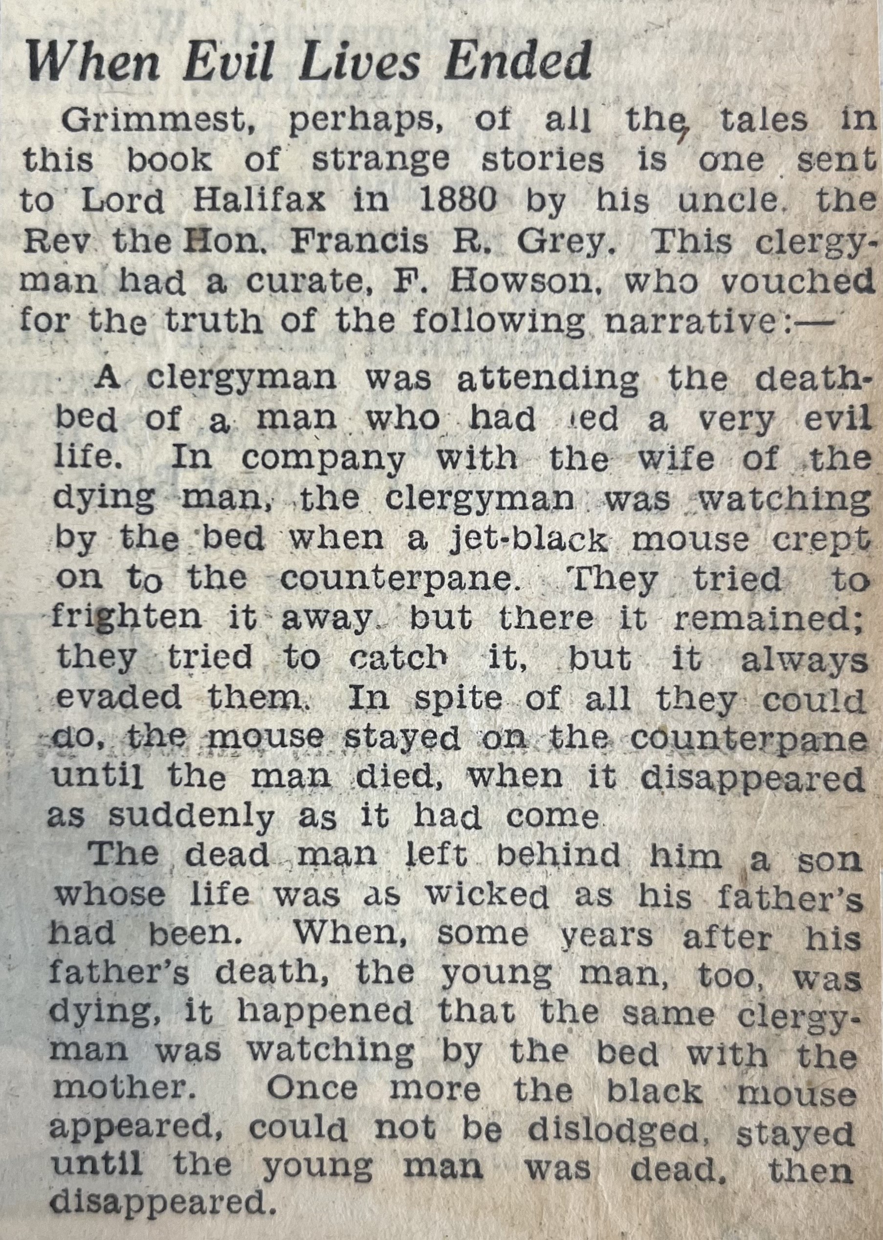 Grimmest, perhaps, of all the tales in this book of strange stories is one sent to Lord Halifax in 1880 by his uncle, the Rev the Hon. Francis R. Grey. This clergyman had a curate. F. Howson, who vouched for the truth of the following, narrative: –