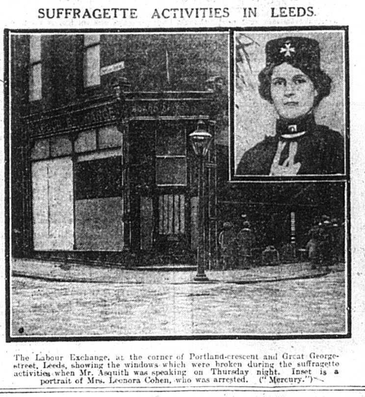 The Prime Minister visited Leeds and the Coliseum again on November 27 1913. Four arrests were made including three suffragettes: one of those was Leonora Cohen. Thousands of Suffragettes gathered in Victoria Square before continuing their demonstration along Great George Street and up to the Coliseum. As they passed the Labour exchange offices at the corner of Great George Street and Portland Crescent the demonstrators through large stones shattering the fifteen feet windows. The Mercury describes the atmosphere as “Electric”. Leonora Cohen was arrested for the smashing of the Window, Jessie Hunter for assaulting the police and two others for disturbance.